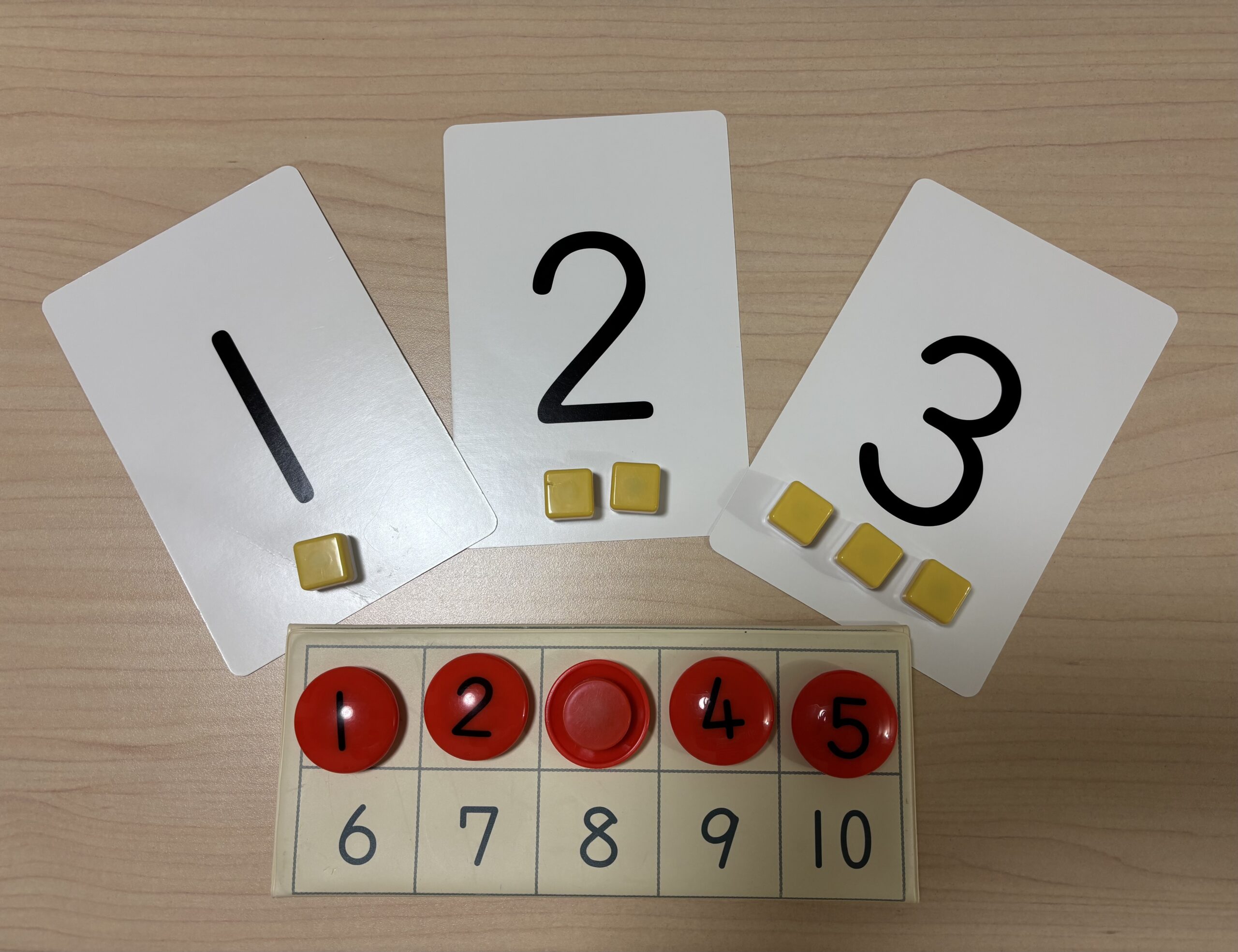 ですので必ず最初に、1から10までの数唱が「歌」になってしまっていないか、「1・2・3」という形と「名称」がきちんと一致しているか、を確認します。一致していない場合は、数字カードなどを使い、一致していくような課題に取り組んでいきます。