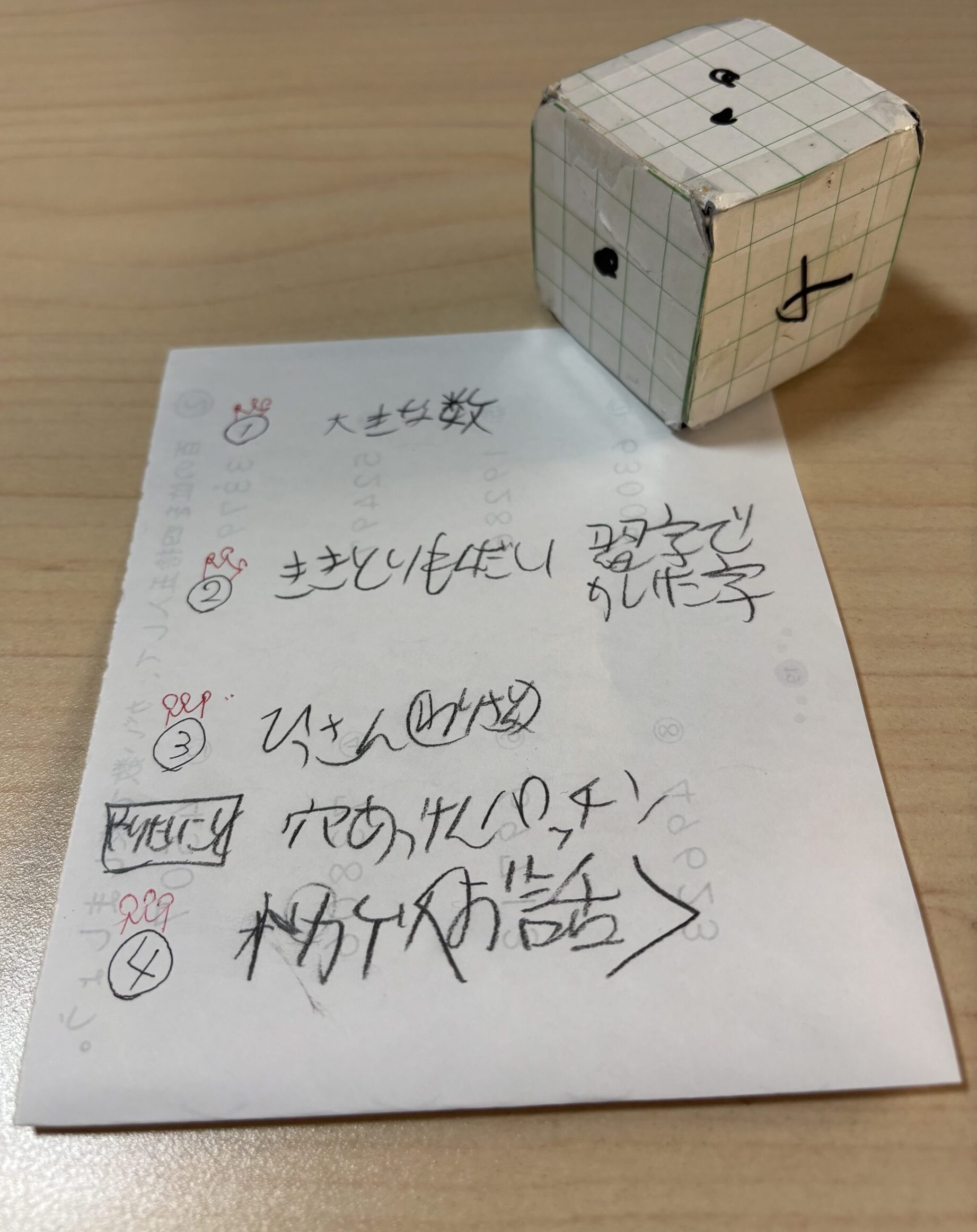教室では、自作のサイコロやあみだくじを使って順番を決める子もいます。苦手なことや、やりたくないと思っていたものが、サイコロの目として先に出てしまうこともありますが、「あーもう、しょうがないなぁ。」と気持ちの切り替えを図り、向き合っています。